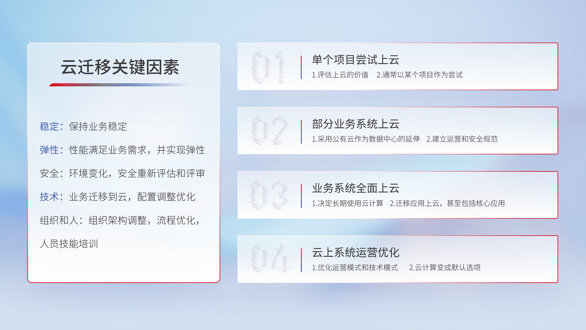 结合实际业务,,,从规划设计、、云平台选型、、云原生改造、、、、数据迁移、、、集成交付,,,迁移全过程为客户识别最佳上云路径,,,做好风险识别管理,,设计网络架构、、、身份权限、、、安全审计合规、、操作审计、、、、日志审计、、、监控告警策略、、、、多站点容灾设计等,,,,对云上基础设施进行整体规划,,提升IT治理水平,,,,以满足弹性、、、、高可用、、、、高性能的需求。。。
