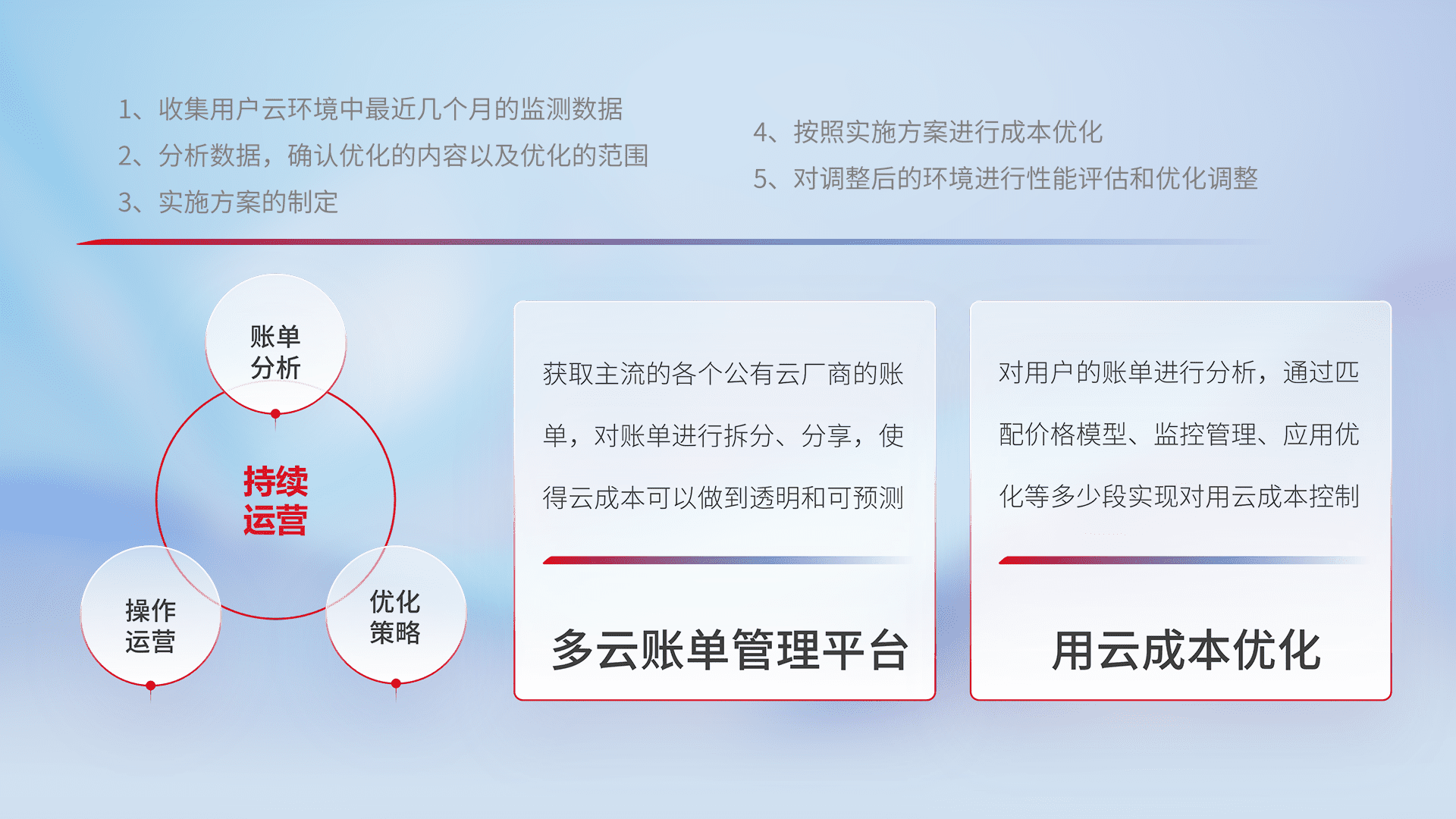 通过多云纳管,,,,以统一的资源数据模型把客户的云资源进行抽象和封装,,进而实现对多云资源的统一操作,,保障云资源管理的可靠性、、、、稳定性与可用性。。。量身定制化运维内容,,配置、、、开发运维、、补丁管理、、、备份、、监控、、认证和访问管理、、、、审计和日常巡检等,,保障在用云过程中的可靠度,,稳定度以及高可用率。。